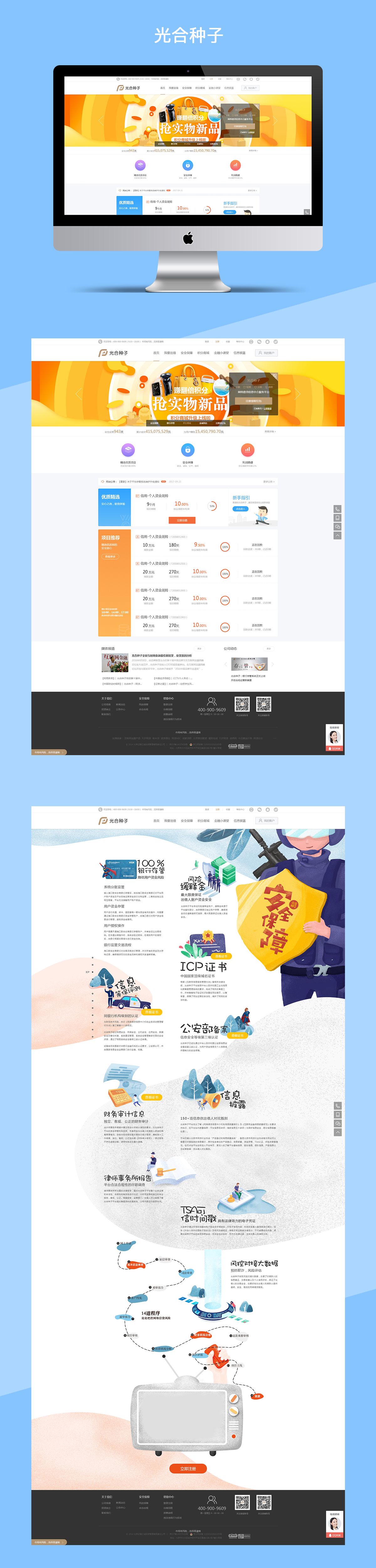 光合种子在线p2p理财网站。这个p2p网站建设的整体布局,是现在流行的和利于用户体验及优化的扁屏F型的一个布局,在线p2p理财网站建设的色彩搭配上使用灰色为主,橙色为辅。而这个在线p2p理财网站建设的整体风格是高端简约的形式展现。导航的规划清晰明了,将光合种子的企业业务、企业文化等重点信息都展示了出来。